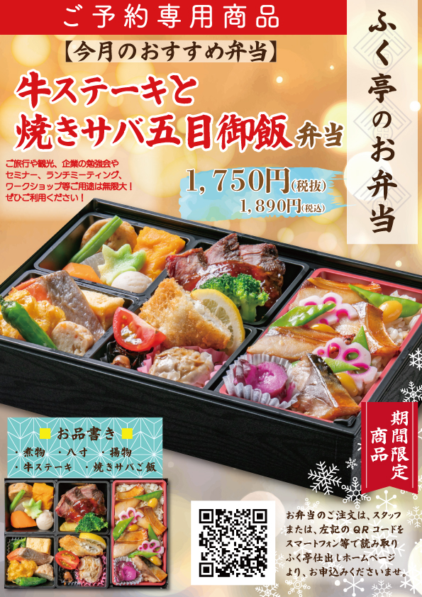 柔らかな牛ステーキと香ばしい焼きサバを一度に楽しめる、お弁当です。