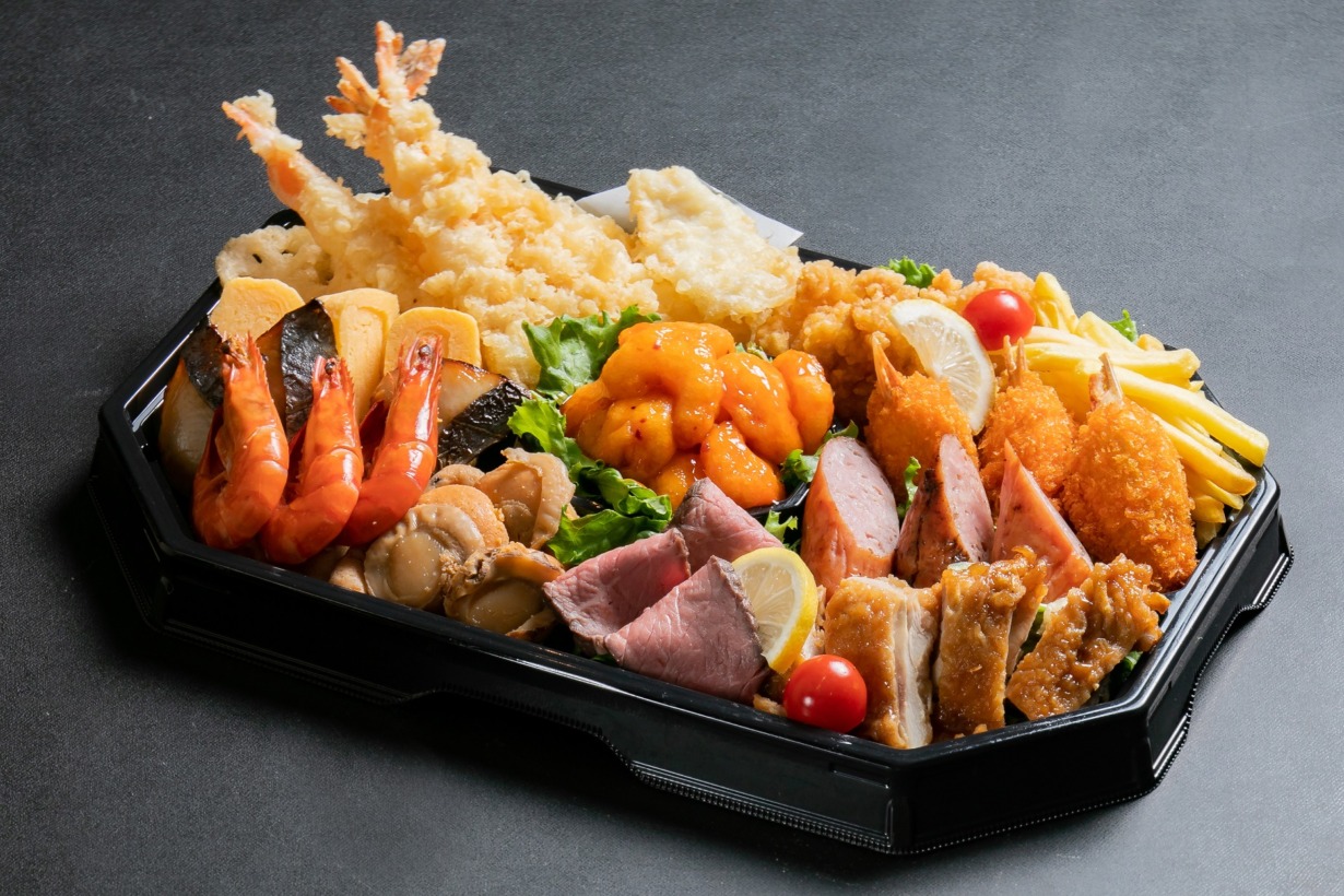 海老芝煮、帆立時雨煮、がんも含め煮、ローストビーフ、ジャンボソーセージ、海老チリソース、鶏竜田揚げ、鶏照り焼き、出し巻き玉子、鰆西京焼き、かに爪フライ、ポテトフライ、天婦羅(海老、いか、蓮根)